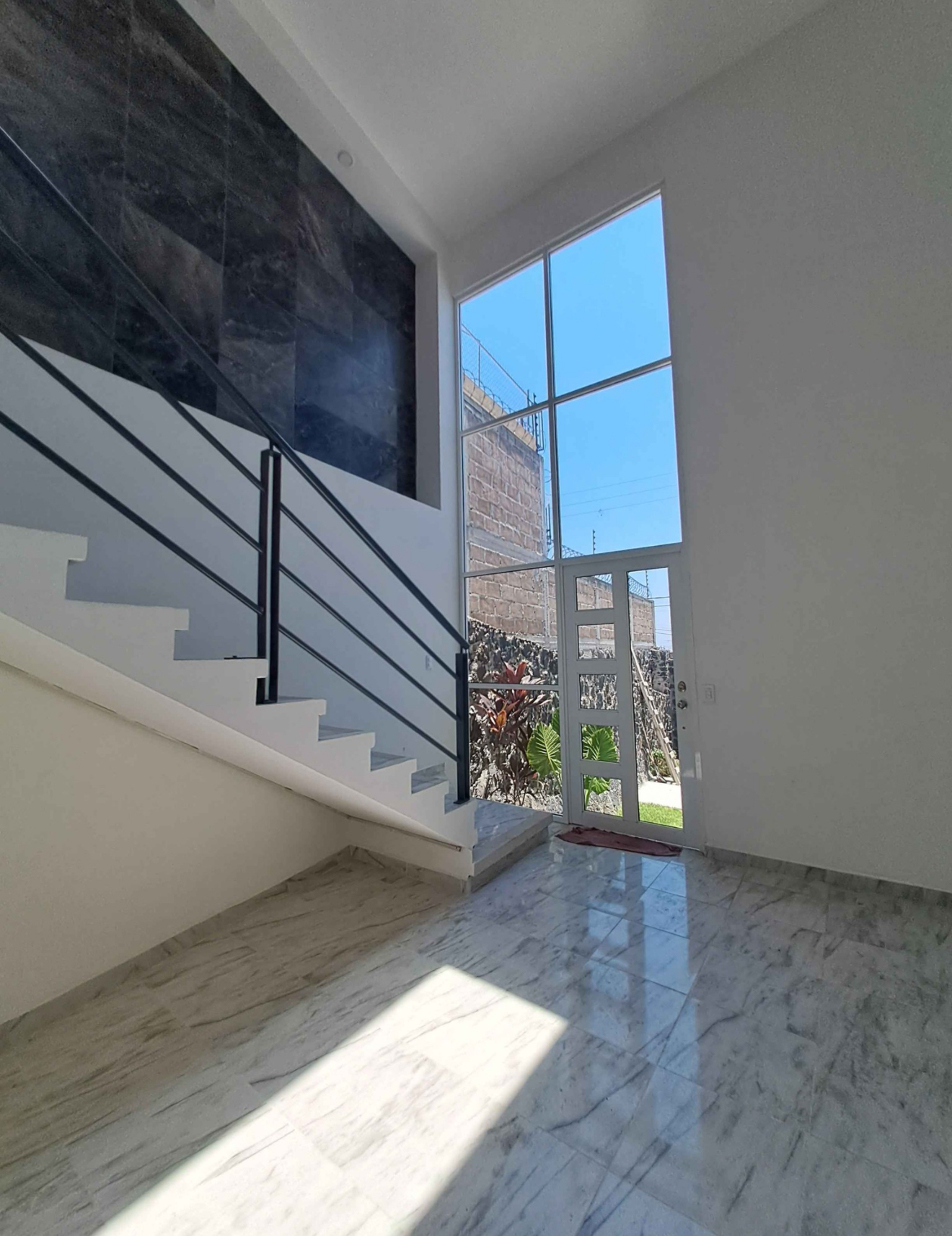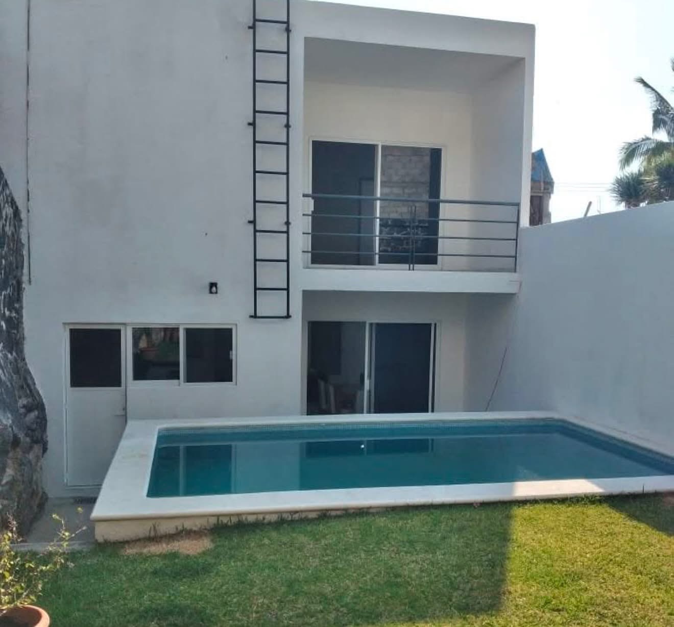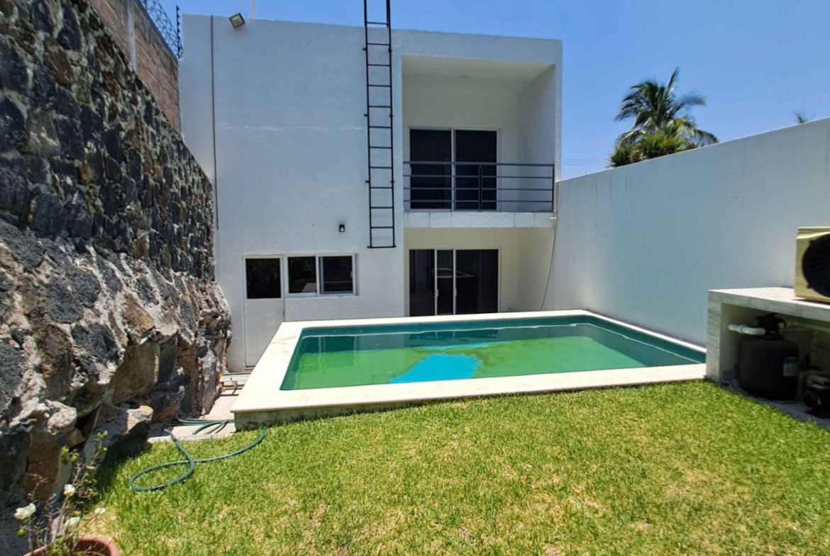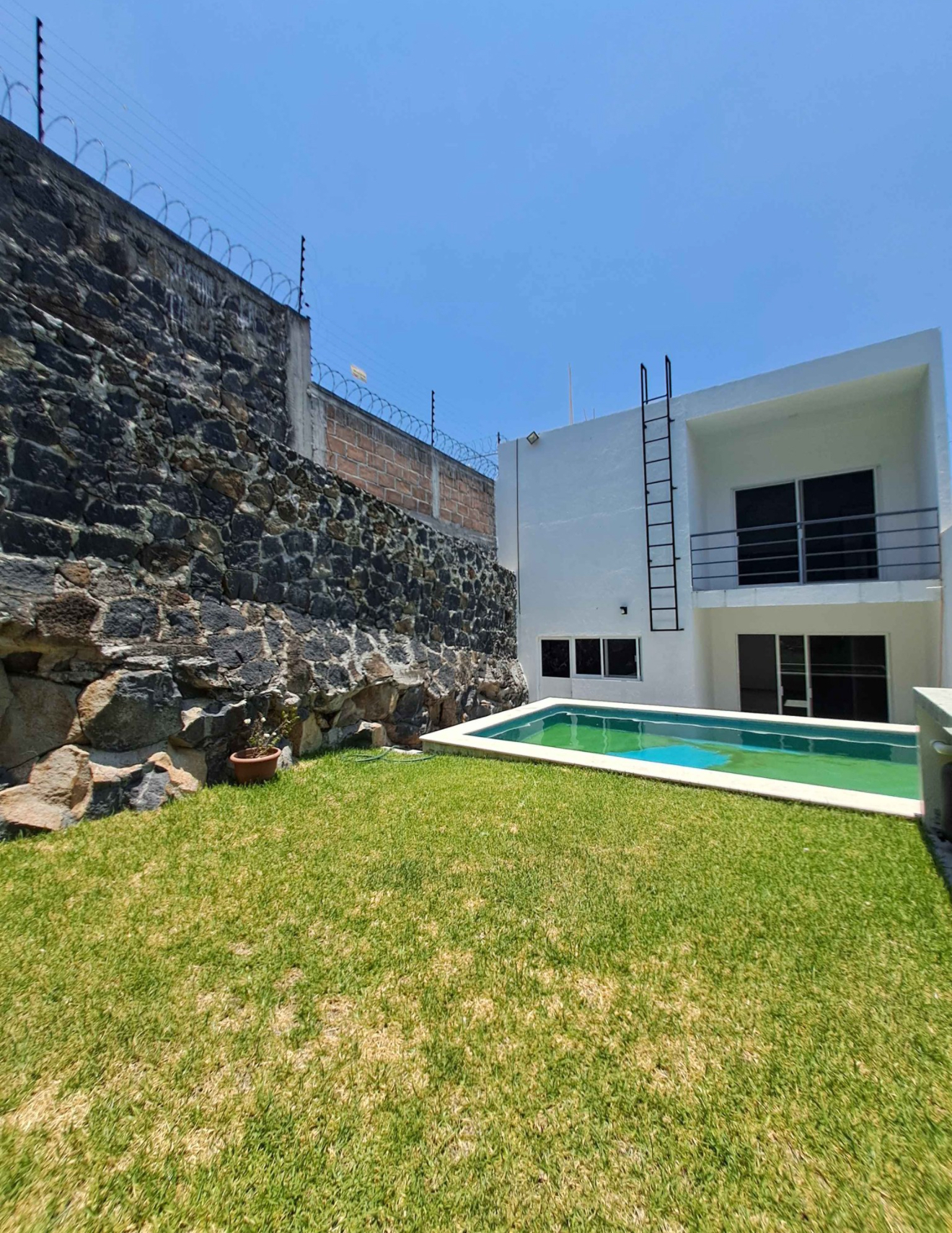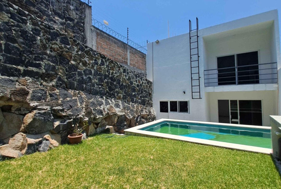 Dispone de 3 recámaras, una de ellas en planta baja, 3 baños y medio, cuarto de lavado, cisterna de 10,000 litros, alberca privada y un pequeño jardín.