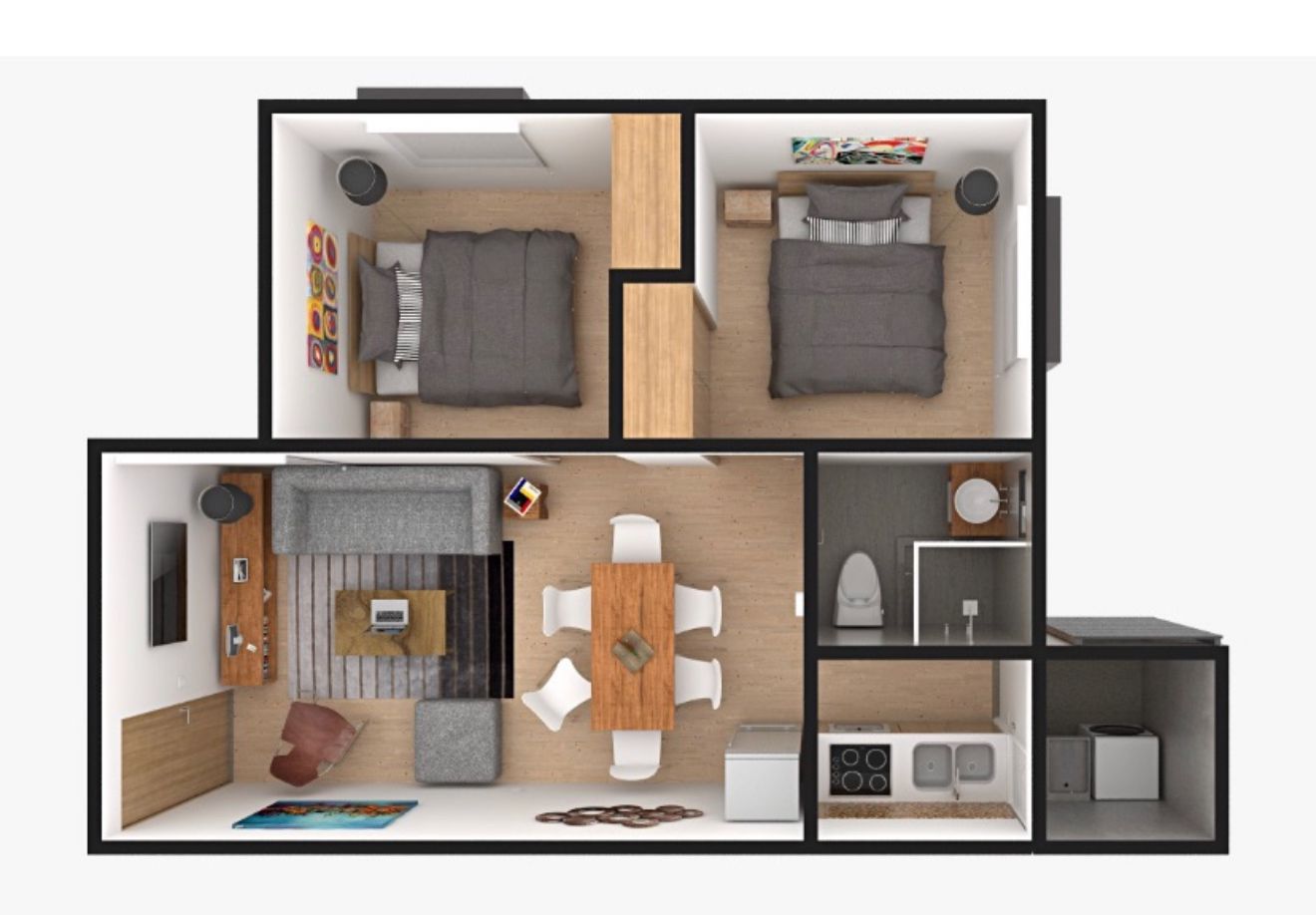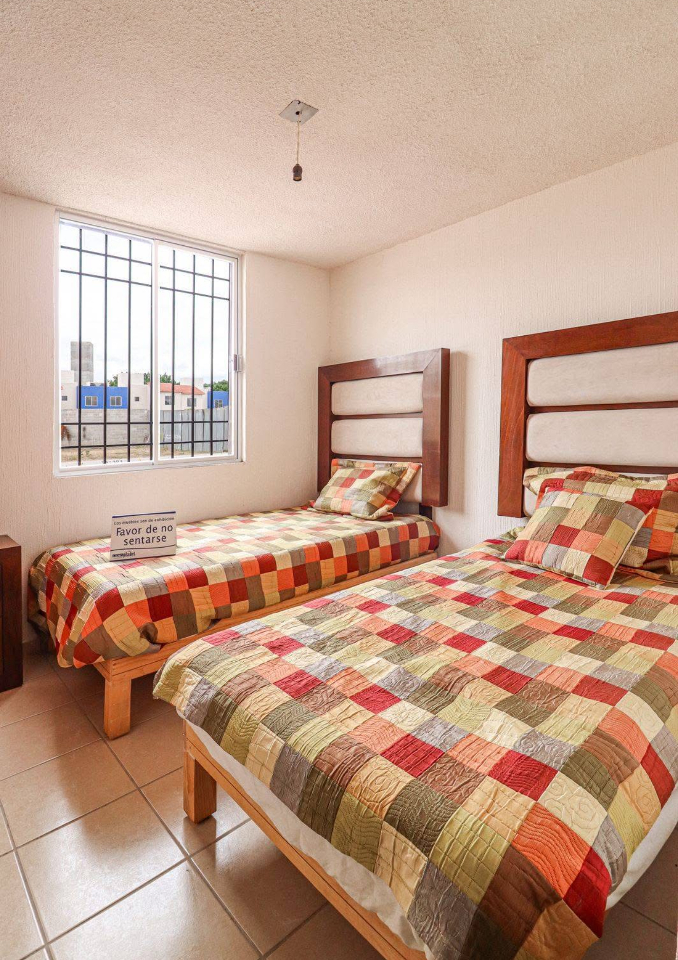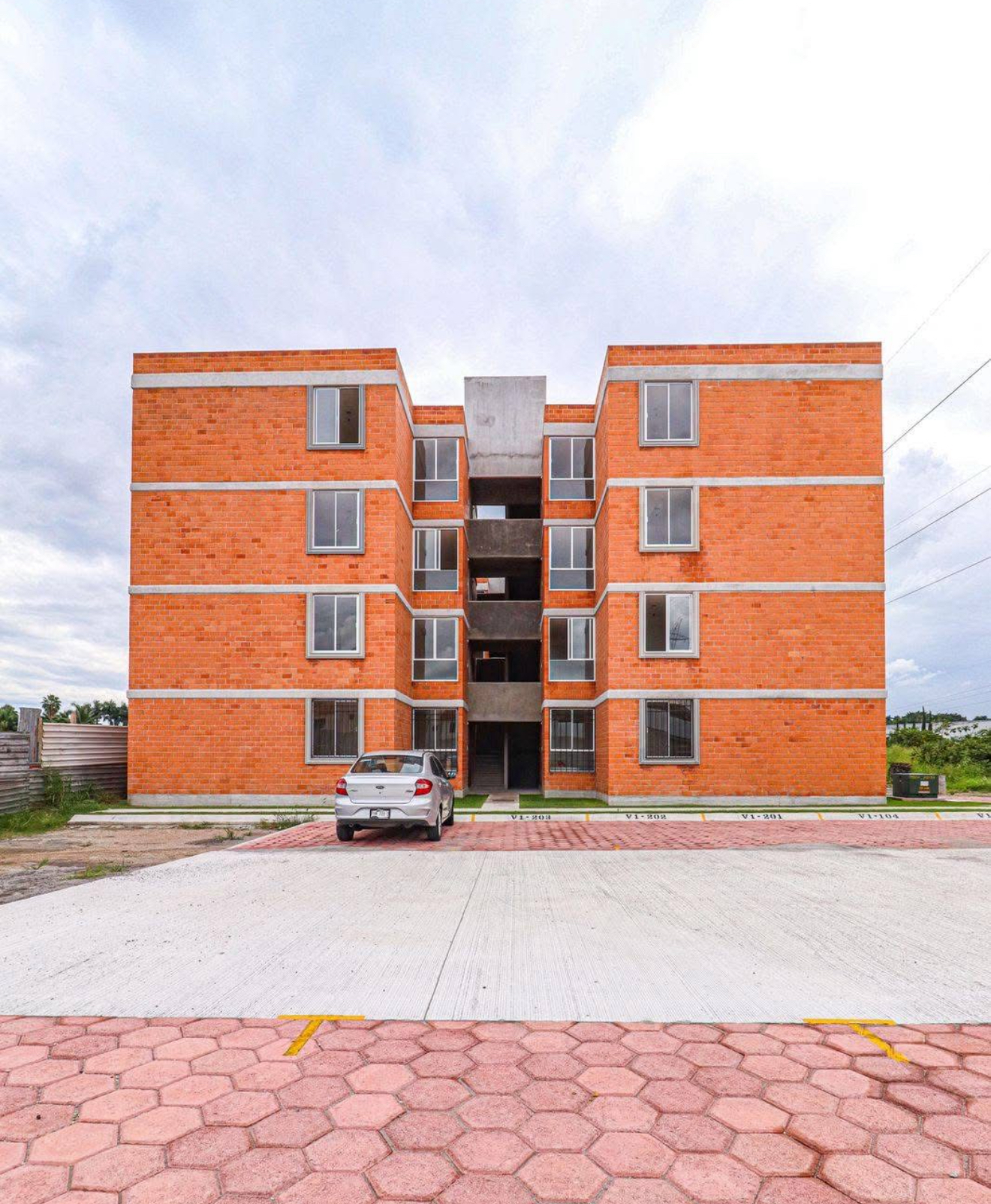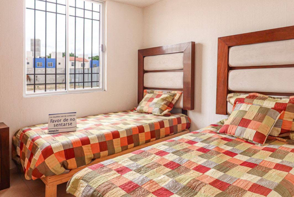 Cada departamento tiene 48 m² de construcción y se distribuye en dos recámaras con área de guardado, estancia, comedor, cocina, baño completo y patio de servicio.